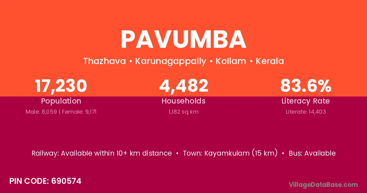 Kayamkulam (15 km) is the nearest town to Pavumba village for major economic activities and is located approximately 15 km away.