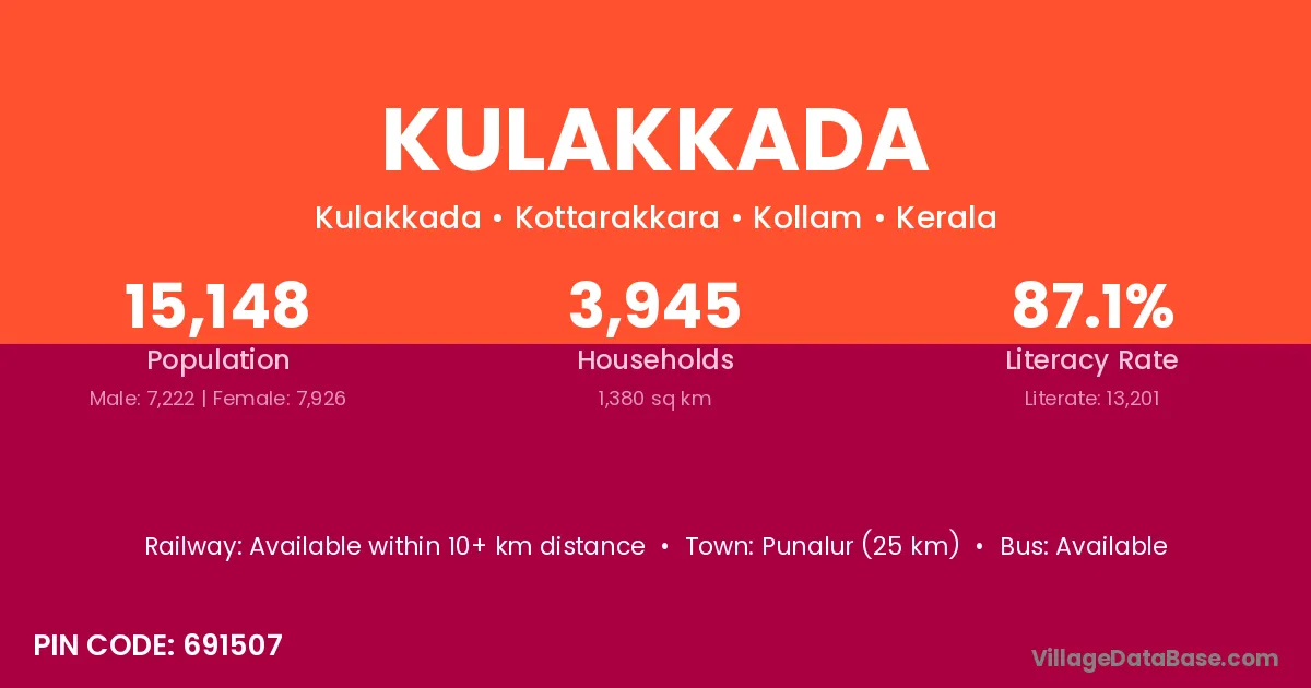 Punalur (25 km) is the nearest town to Kulakkada village for major economic activities and is located approximately 25 km away.