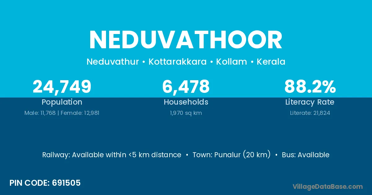 Punalur (20 km) is the nearest town to Neduvathoor village for major economic activities and is located approximately 20 km away.