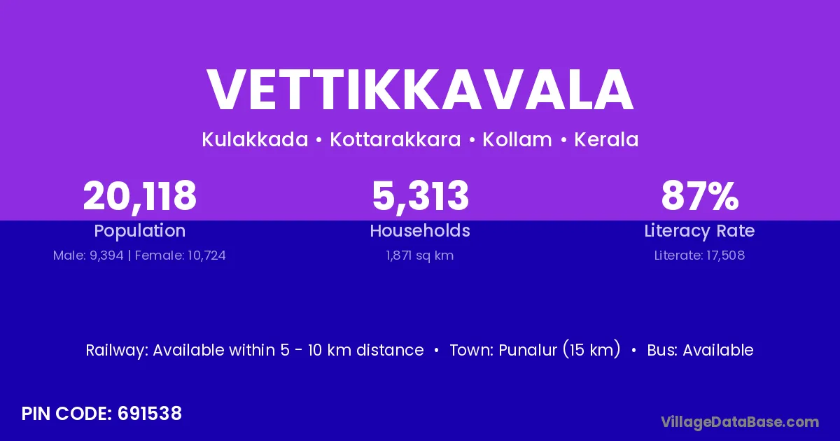 Punalur (15 km) is the nearest town to Vettikkavala village for major economic activities and is located approximately 15 km away.