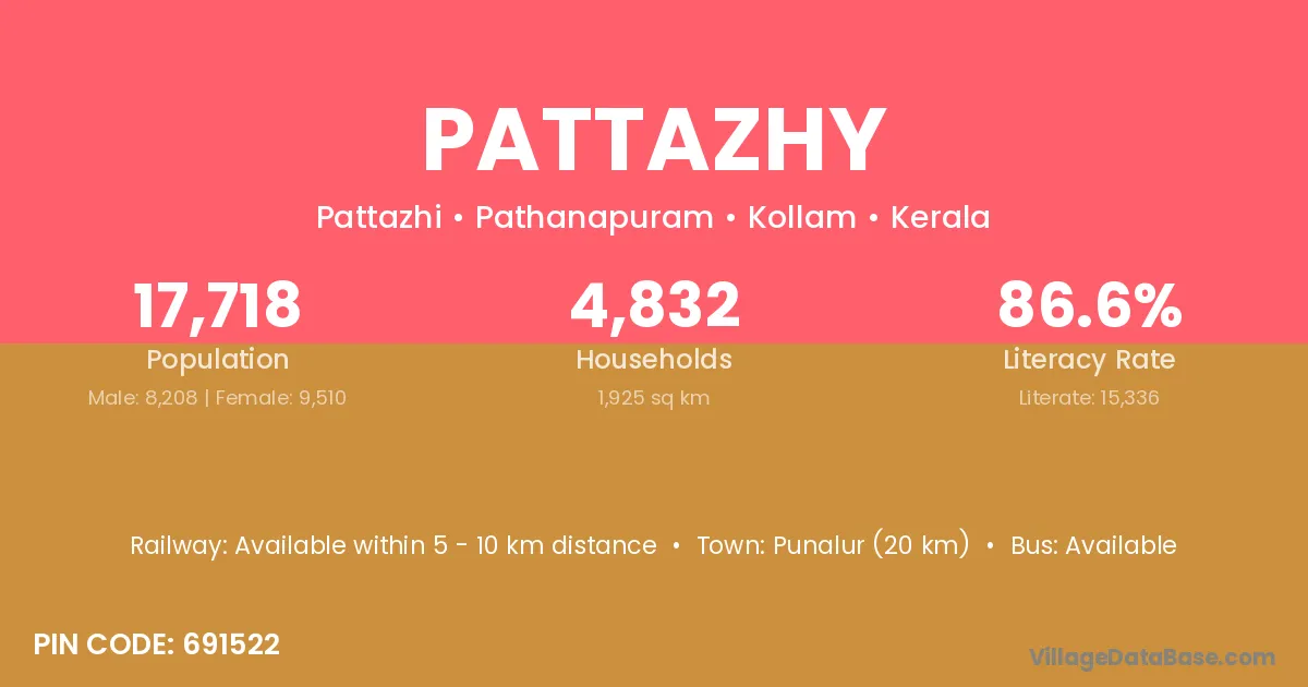 Punalur (20 km) is the nearest town to Pattazhy village for major economic activities and is located approximately 20 km away.