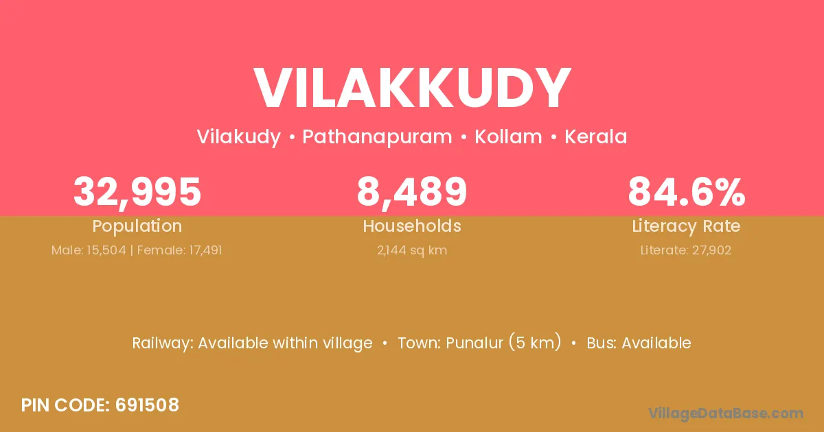 Punalur (5 km) is the nearest town to Vilakkudy village for major economic activities and is located approximately 5 km away.