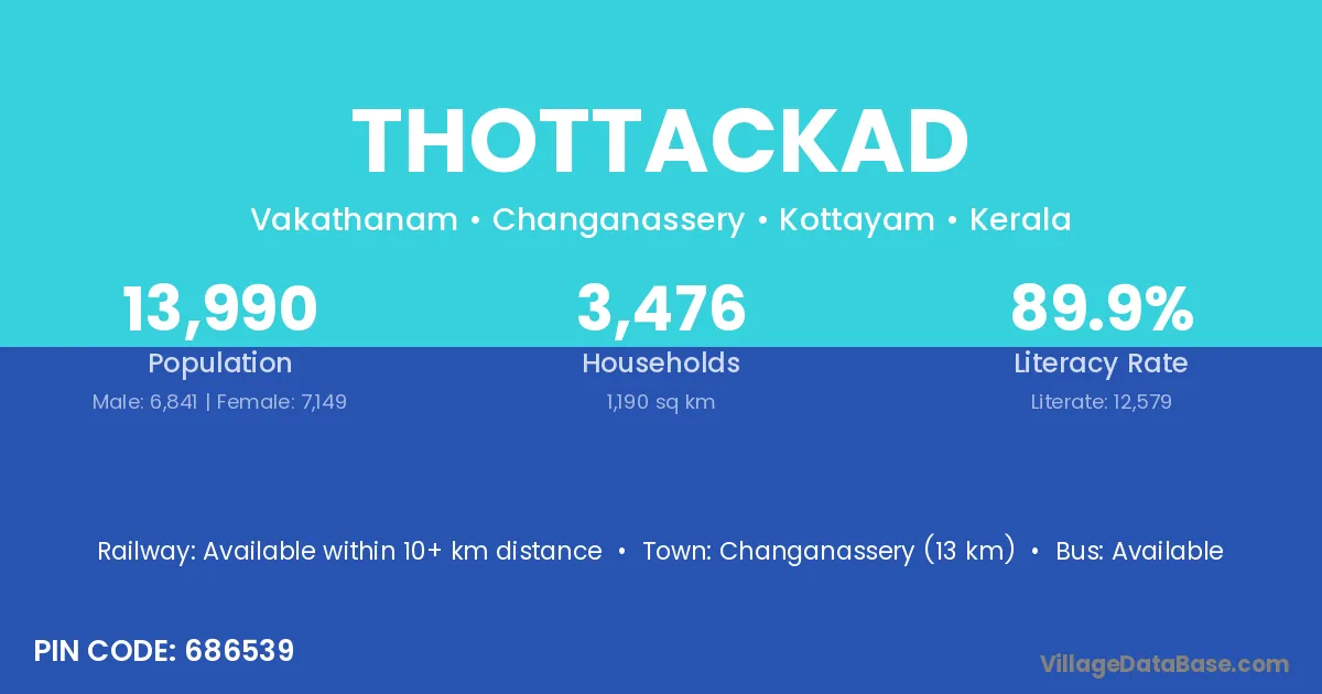 Changanassery (13 km) is the nearest town to Thottackad village for major economic activities and is located approximately 13 km away.