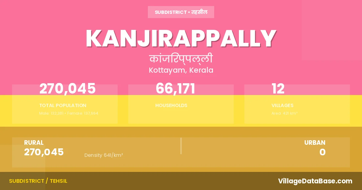 According to the 2011 census The total area of Kanjirappally Taluka is 421 km², with a population of 270045 people. The population density is 641 inhabitants per square kilometre, and there are approximately 66171 houses in the sub district.