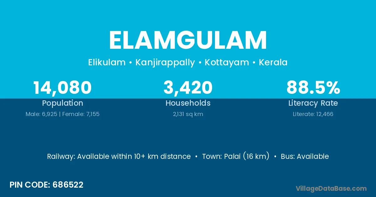 Palai (16 km) is the nearest town to Elamgulam village for major economic activities and is located approximately 16 km away.