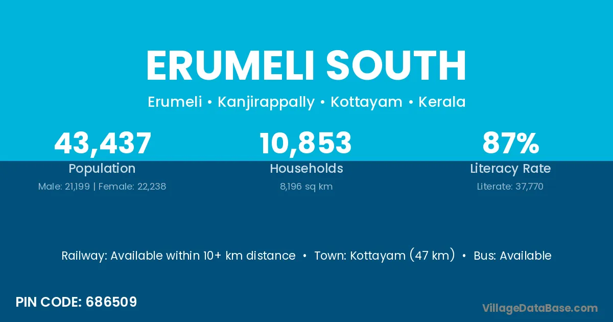 Erumeli South village has a total population of 43,437 people, of which 21,199 are males and 22,238 are females.