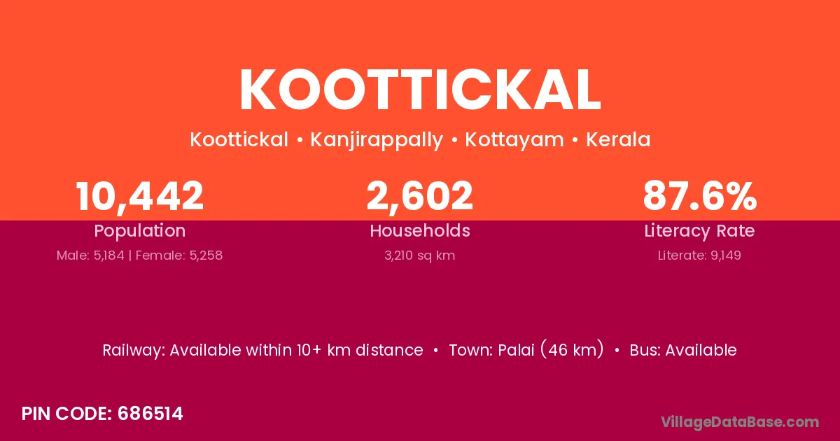 Koottickal village has a total population of 10,442 people, of which 5,184 are males and 5,258 are females.