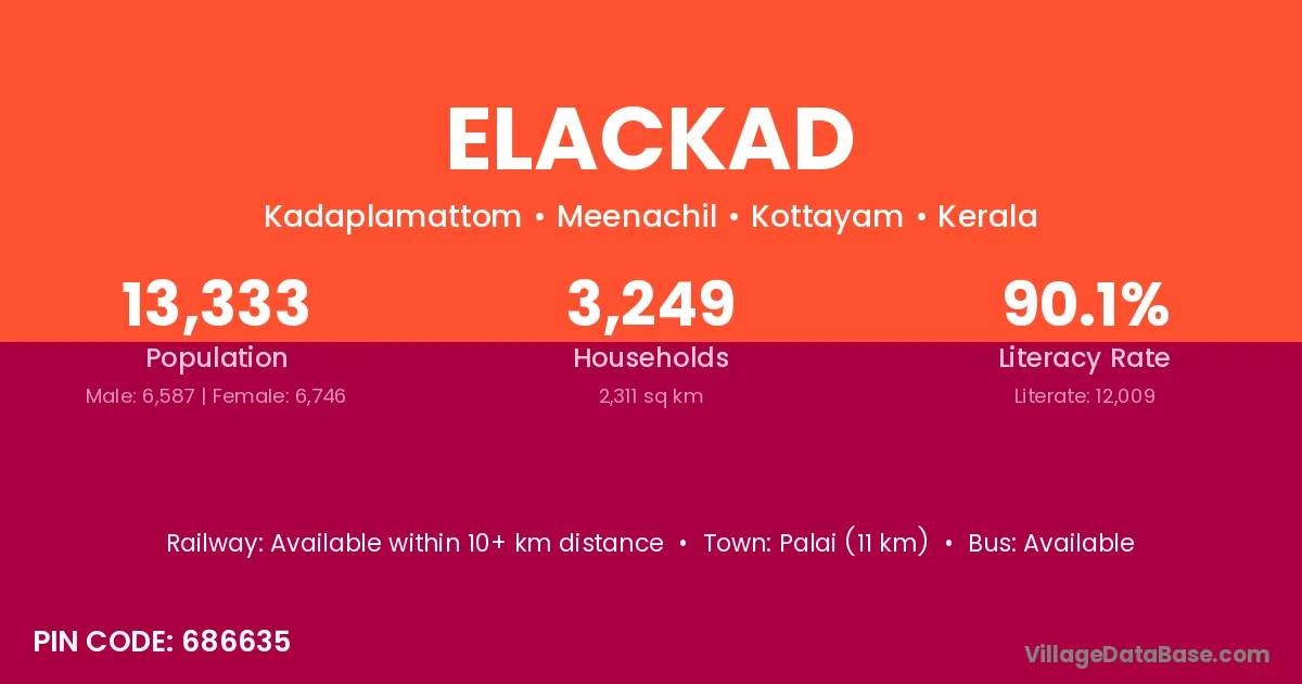 Palai (11 km) is the nearest town to Elackad village for major economic activities and is located approximately 11 km away.