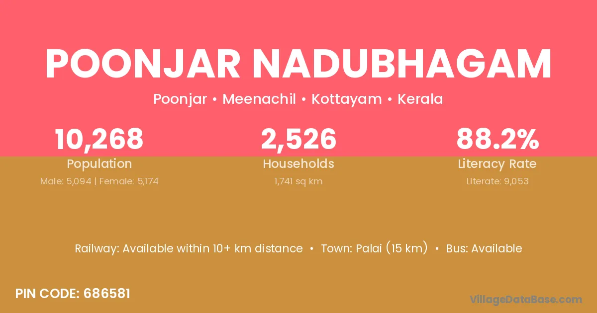 Palai (15 km) is the nearest town to Poonjar Nadubhagam village for major economic activities and is located approximately 15 km away.