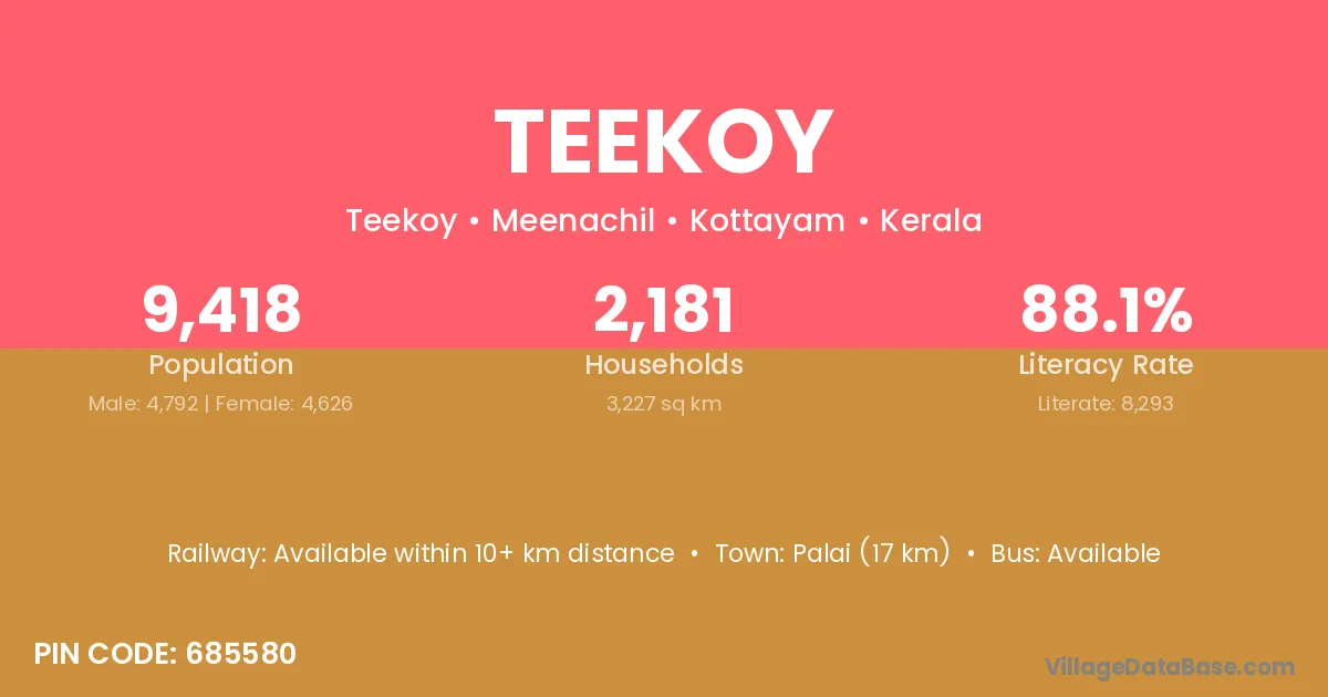 Palai (17 km) is the nearest town to Teekoy village for major economic activities and is located approximately 17 km away.