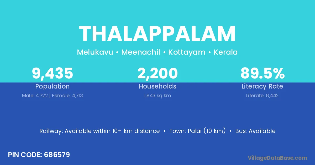 Palai (10 km) is the nearest town to Thalappalam village for major economic activities and is located approximately 10 km away.