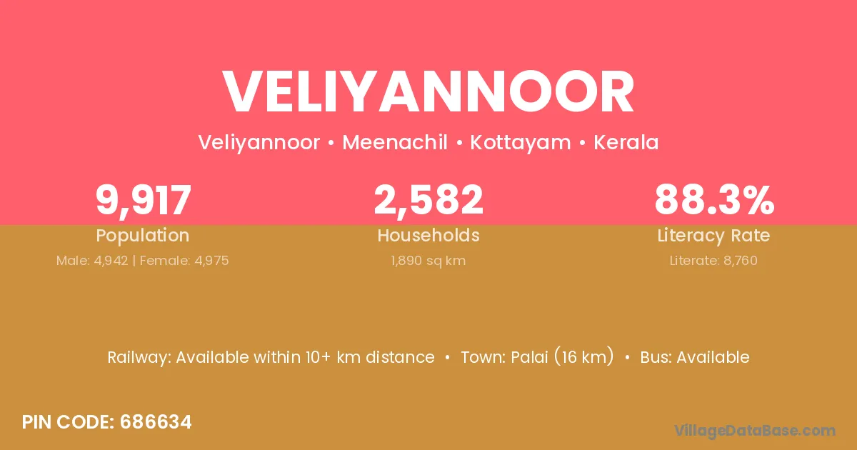 Palai (16 km) is the nearest town to Veliyannoor village for major economic activities and is located approximately 16 km away.