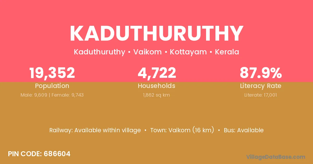 Kaduthuruthy village has a total population of 19,352 people, of which 9,609 are males and 9,743 are females.