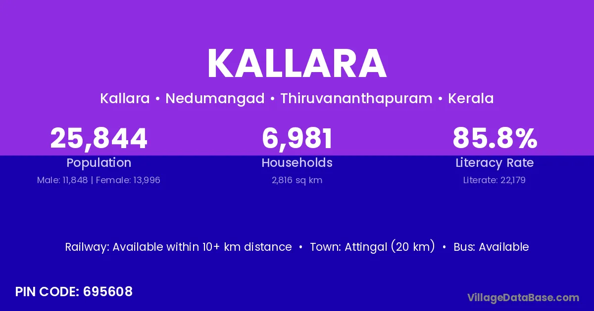 Kallara village has a total population of 13,562 people, of which 6,686 are males and 6,876 are females.