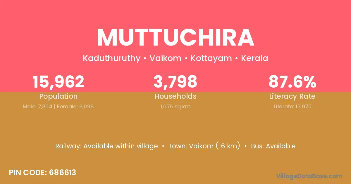 Vaikom (16 km) is the nearest town to Muttuchira village for major economic activities and is located approximately 16 km away.