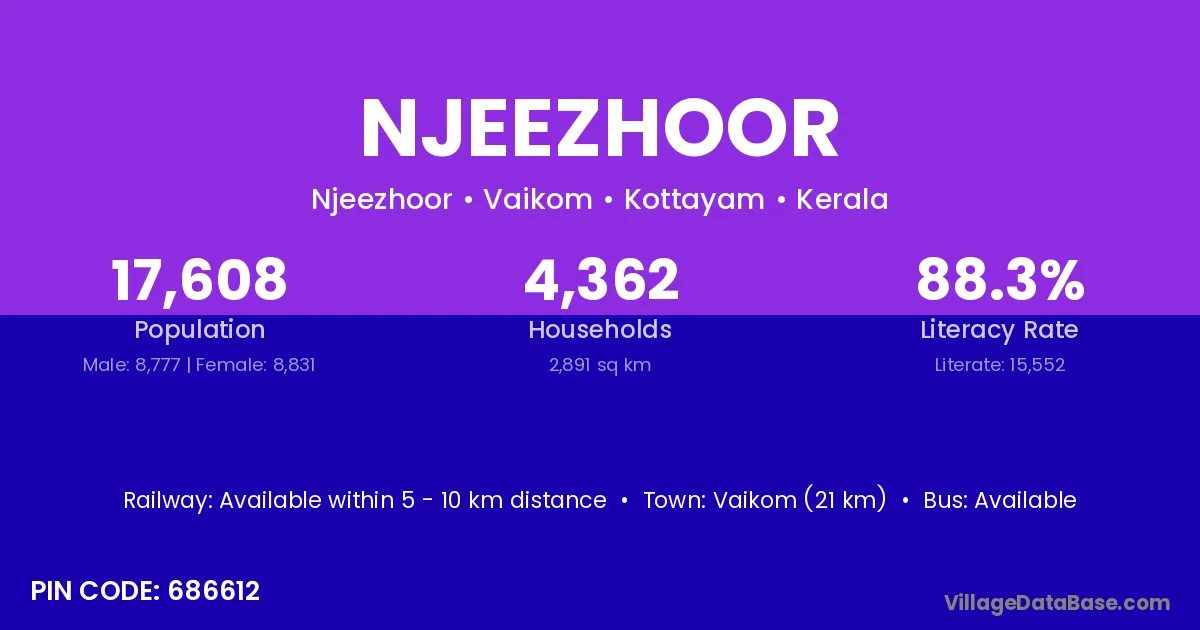 Vaikom (21 km) is the nearest town to Njeezhoor village for major economic activities and is located approximately 21 km away.
