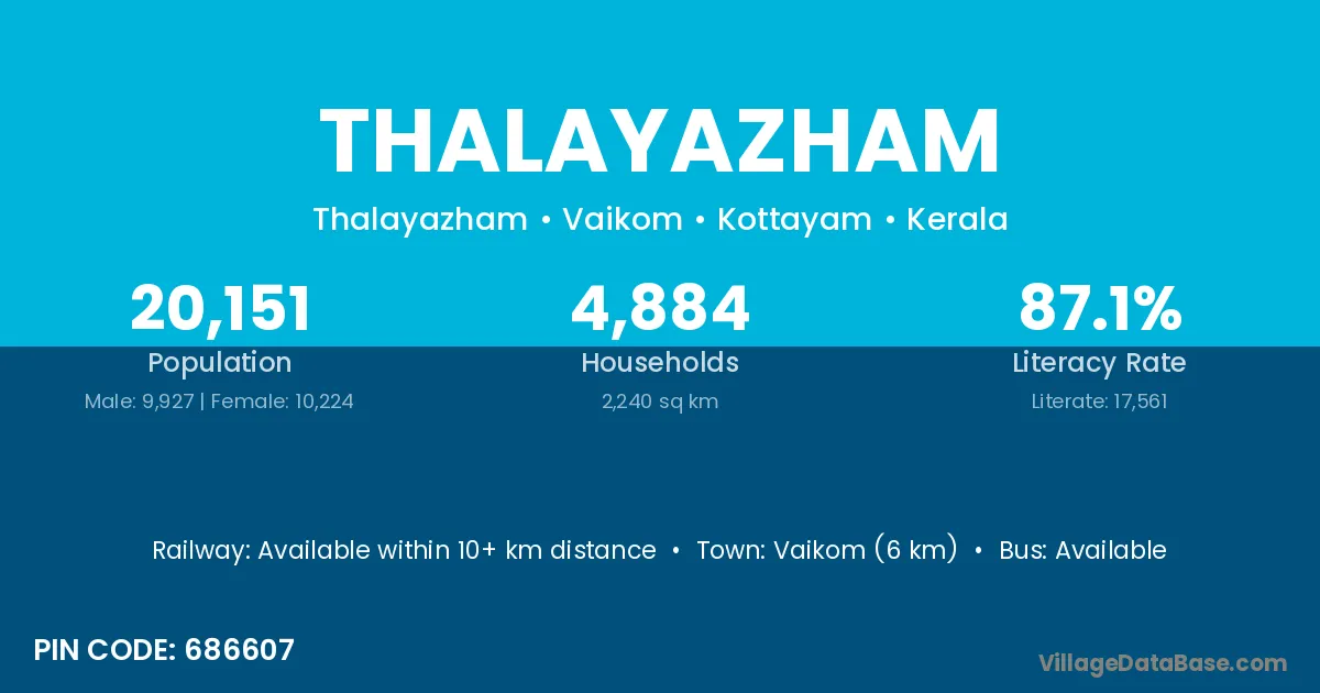 Vaikom (6 km) is the nearest town to Thalayazham village for major economic activities and is located approximately 6 km away.