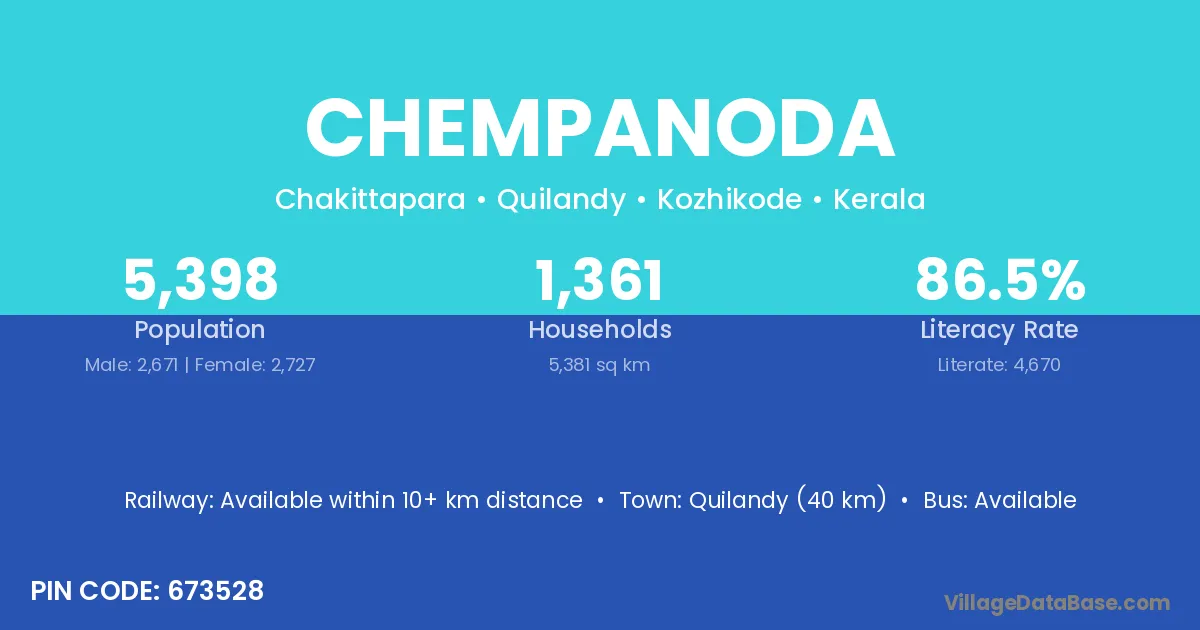 Quilandy (40 km) is the nearest town to Chempanoda village for major economic activities and is located approximately 40 km away.