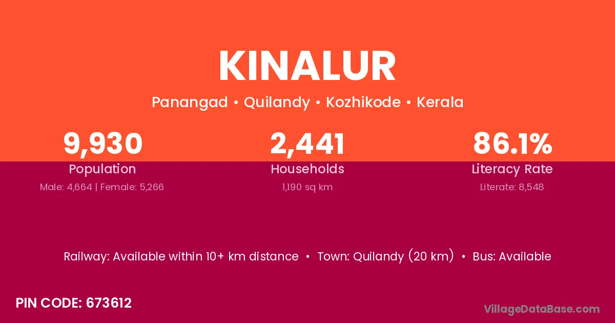 Quilandy (20 km) is the nearest town to Kinalur village for major economic activities and is located approximately 20 km away.