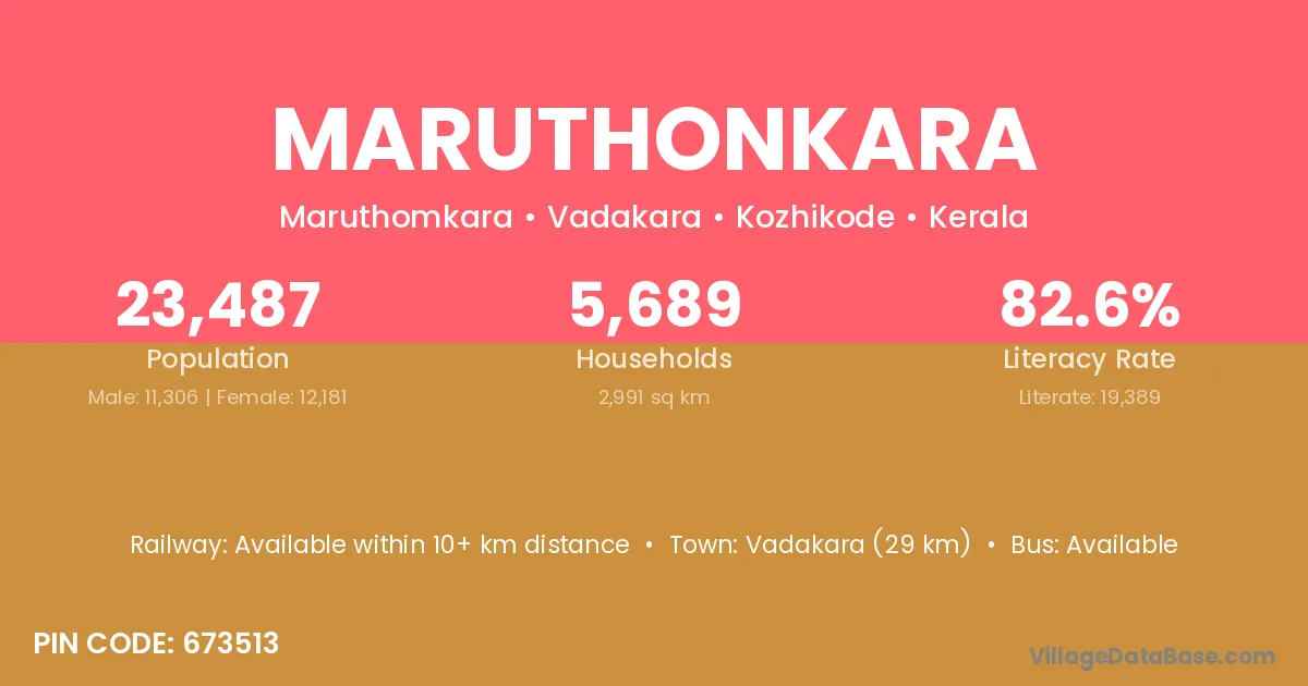 Maruthonkara village has a total population of 23,487 people, of which 11,306 are males and 12,181 are females.