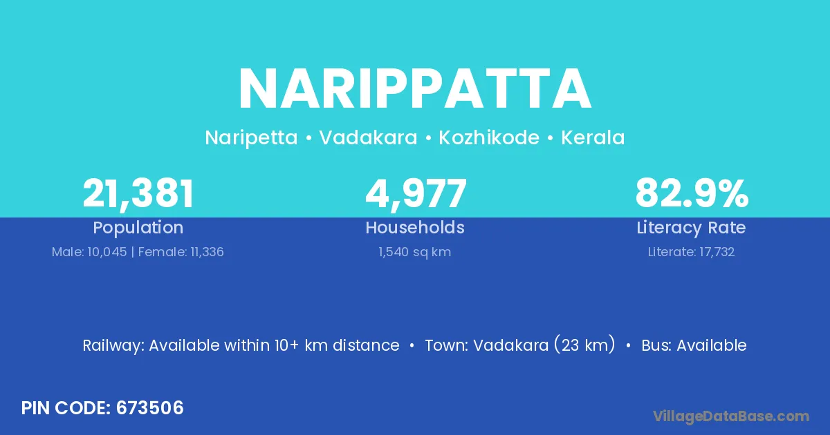 Vadakara (23 km) is the nearest town to Narippatta village for major economic activities and is located approximately 23 km away.