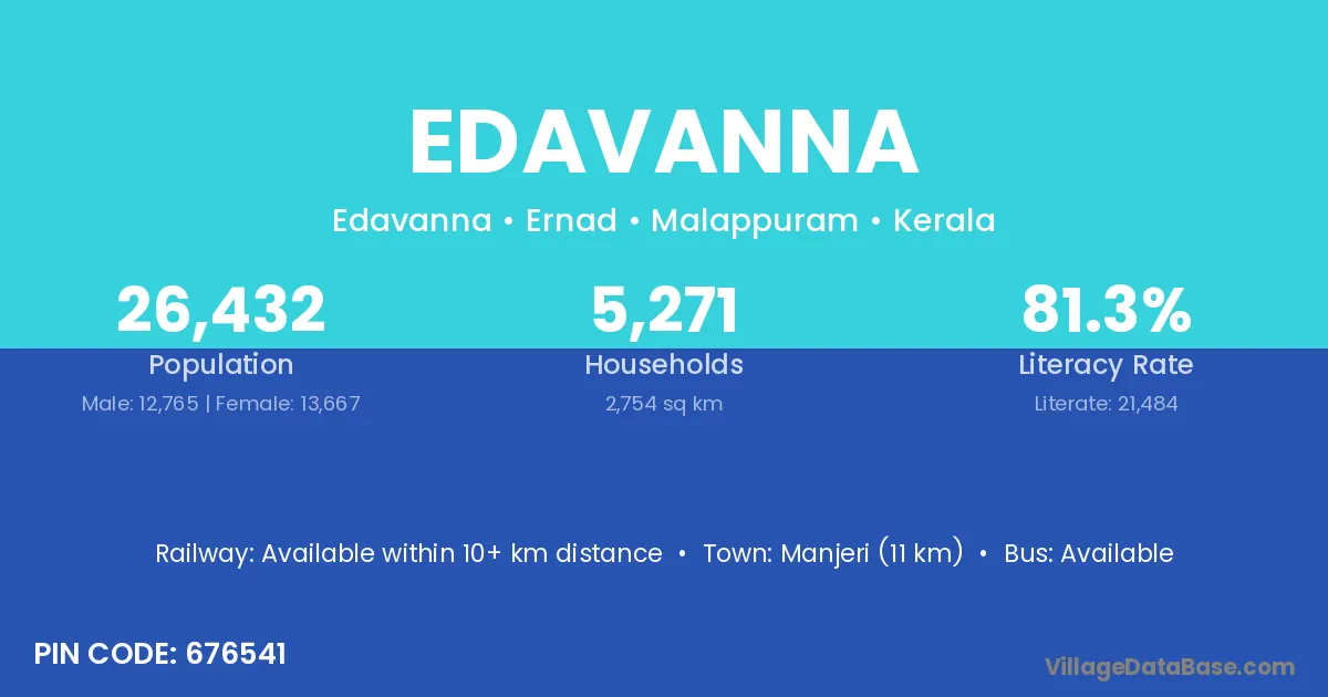 Manjeri (11 km) is the nearest town to Edavanna village for major economic activities and is located approximately 11 km away.
