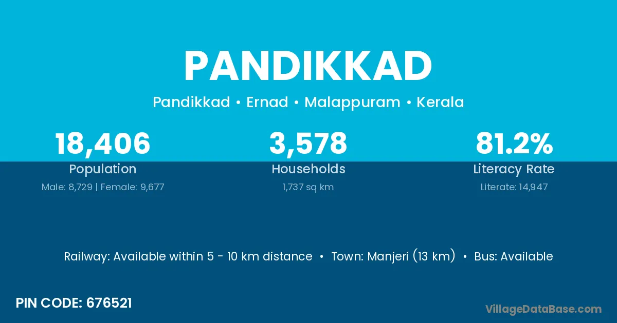 Manjeri (13 km) is the nearest town to Pandikkad village for major economic activities and is located approximately 13 km away.