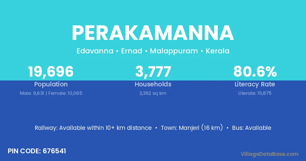 Manjeri (16 km) is the nearest town to Perakamanna village for major economic activities and is located approximately 16 km away.