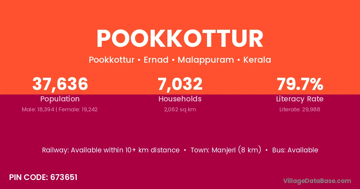 Manjeri (8 km) is the nearest town to Pookkottur village for major economic activities and is located approximately 8 km away.