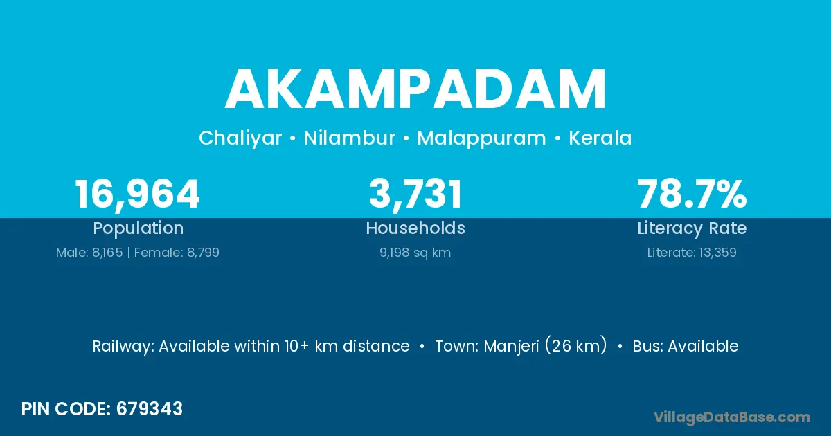 Manjeri (26 km) is the nearest town to Akampadam village for major economic activities and is located approximately 26 km away.
