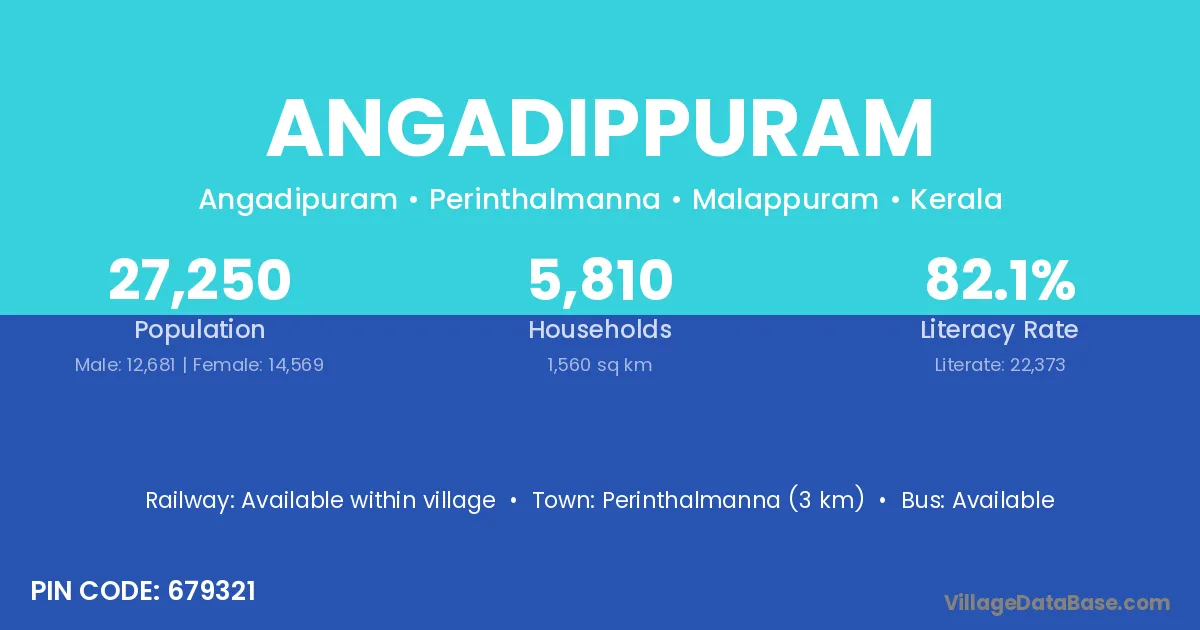 Angadippuram village has a total population of 27,250 people, of which 12,681 are males and 14,569 are females.