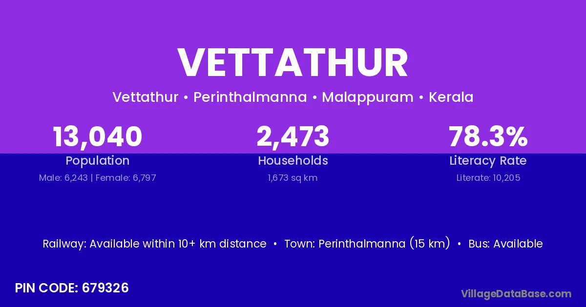 Perinthalmanna (15 km) is the nearest town to Vettathur village for major economic activities and is located approximately 15 km away.