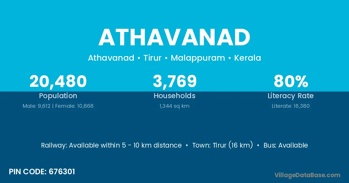 Tirur (16 km) is the nearest town to Athavanad village for major economic activities and is located approximately 16 km away.