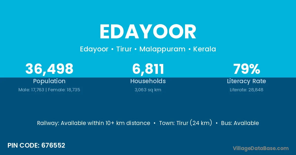 Tirur (24 km) is the nearest town to Edayoor village for major economic activities and is located approximately 24 km away.