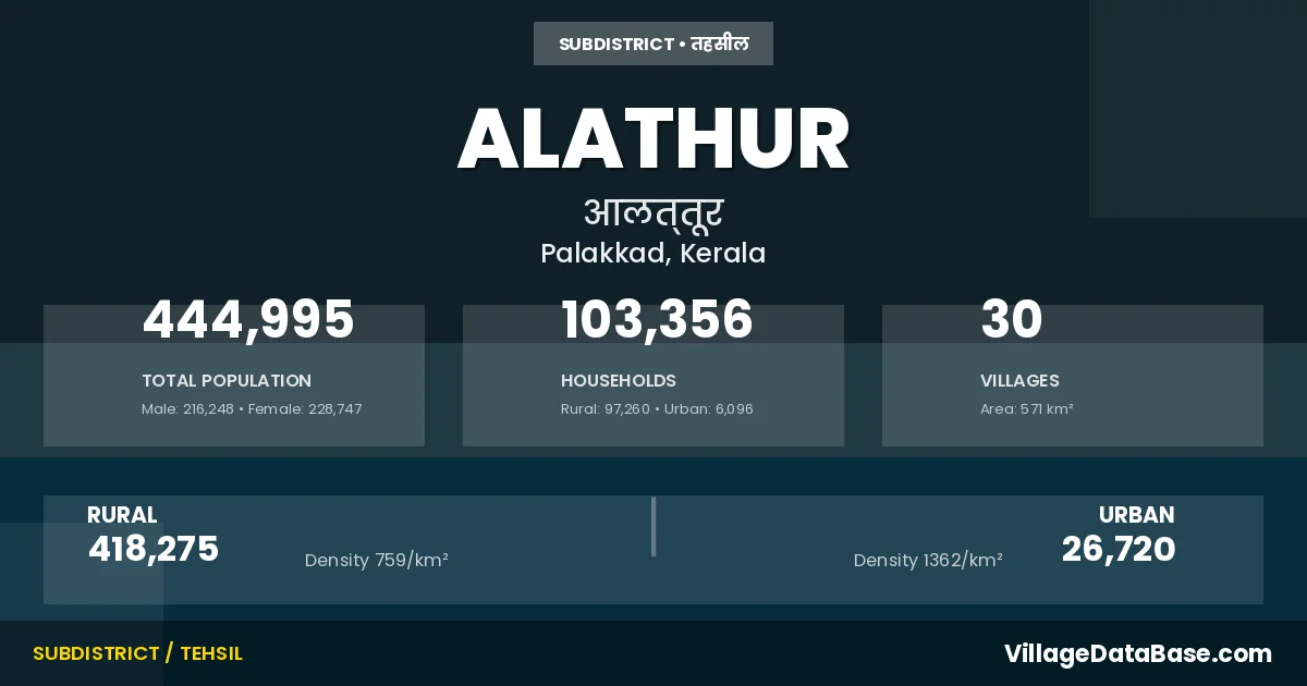 According to the 2011 census The total area of Alathur Taluka is 571 km², with a population of 444995 people. The population density is 779 inhabitants per square kilometre, and there are approximately 103356 houses in the sub district.
