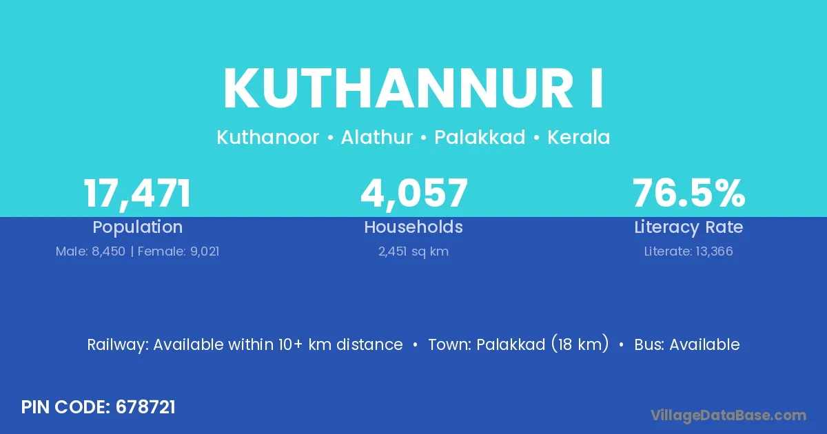 Palakkad (18 km) is the nearest town to Kuthannur I village for major economic activities and is located approximately 18 km away.