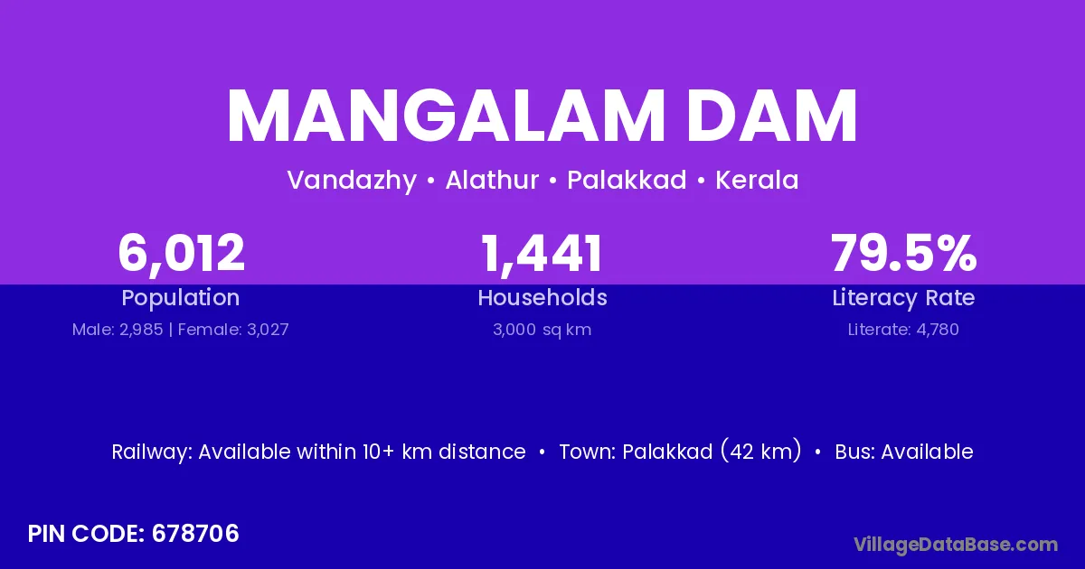 Palakkad (42 km) is the nearest town to Mangalam Dam village for major economic activities and is located approximately 42 km away.
