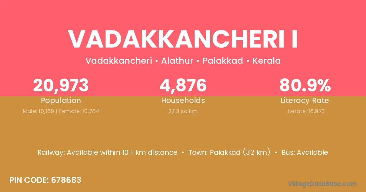 Vadakkancheri I village has a total population of 20,973 people, of which 10,189 are males and 10,784 are females.
