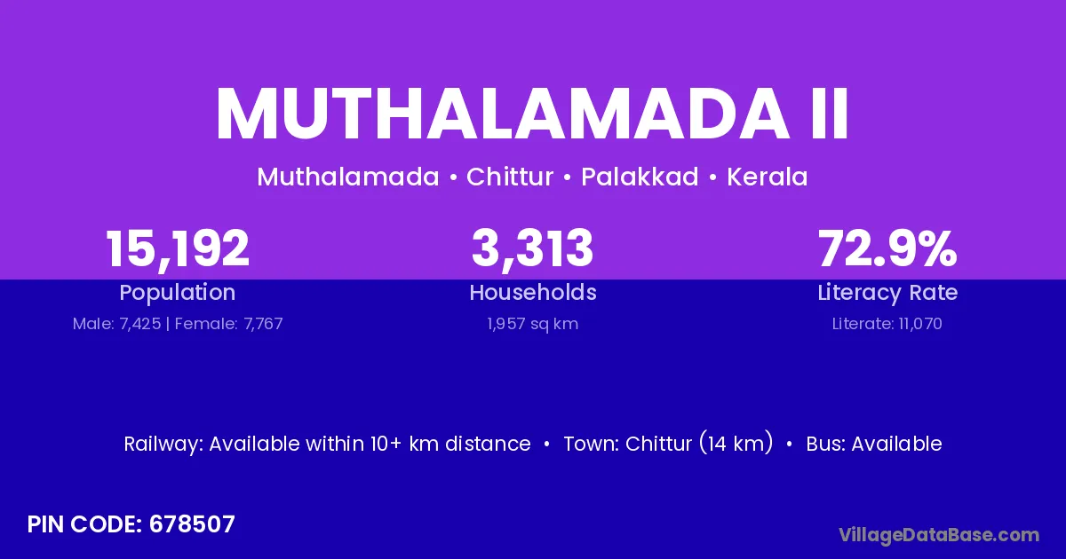 Chittur (14 km) is the nearest town to Muthalamada Ii village for major economic activities and is located approximately 14 km away.