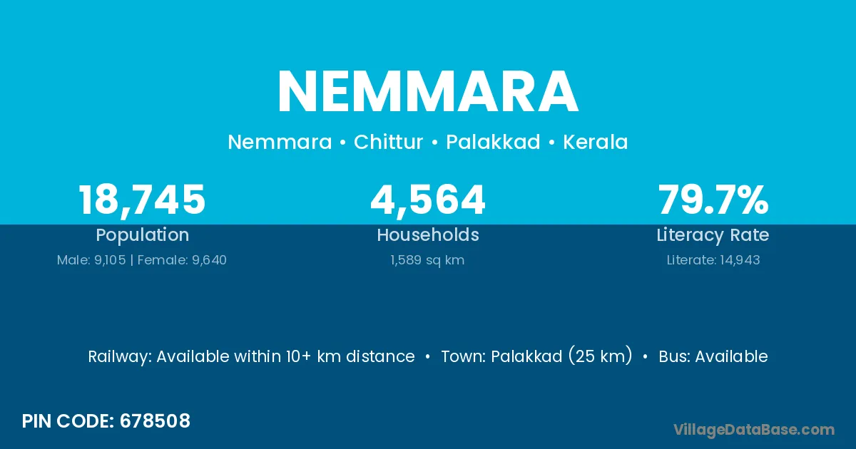 Palakkad (25 km) is the nearest town to Nemmara village for major economic activities and is located approximately 25 km away.
