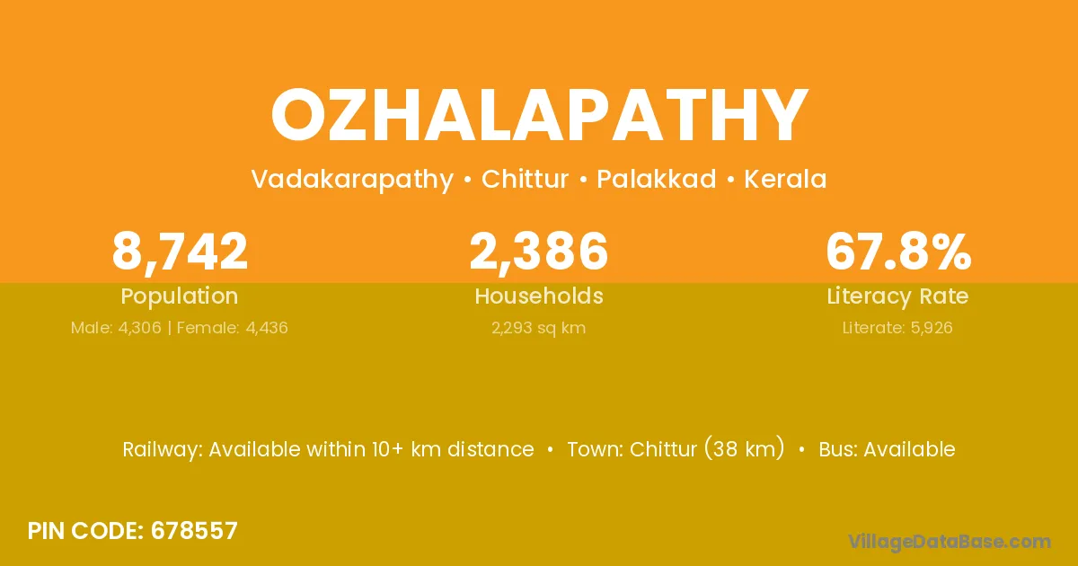 Chittur (38 km) is the nearest town to Ozhalapathy village for major economic activities and is located approximately 38 km away.