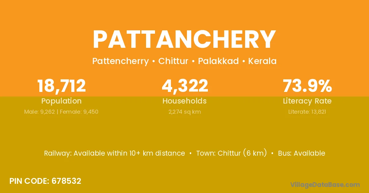 Chittur (6 km) is the nearest town to Pattanchery village for major economic activities and is located approximately 6 km away.