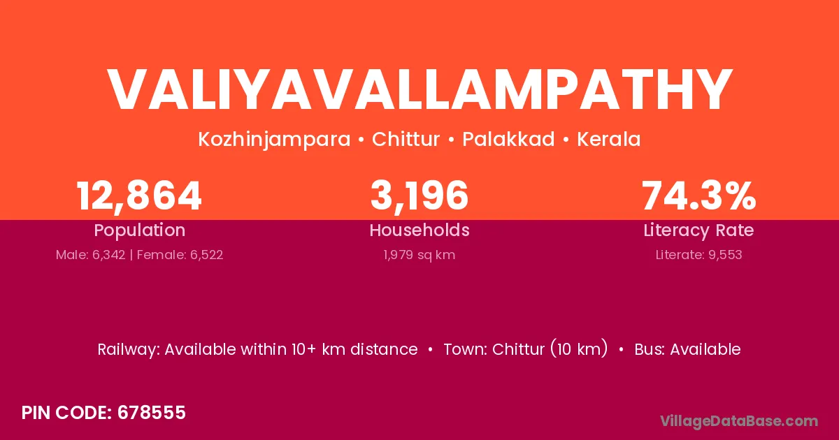 Chittur (10 km) is the nearest town to Valiyavallampathy village for major economic activities and is located approximately 10 km away.