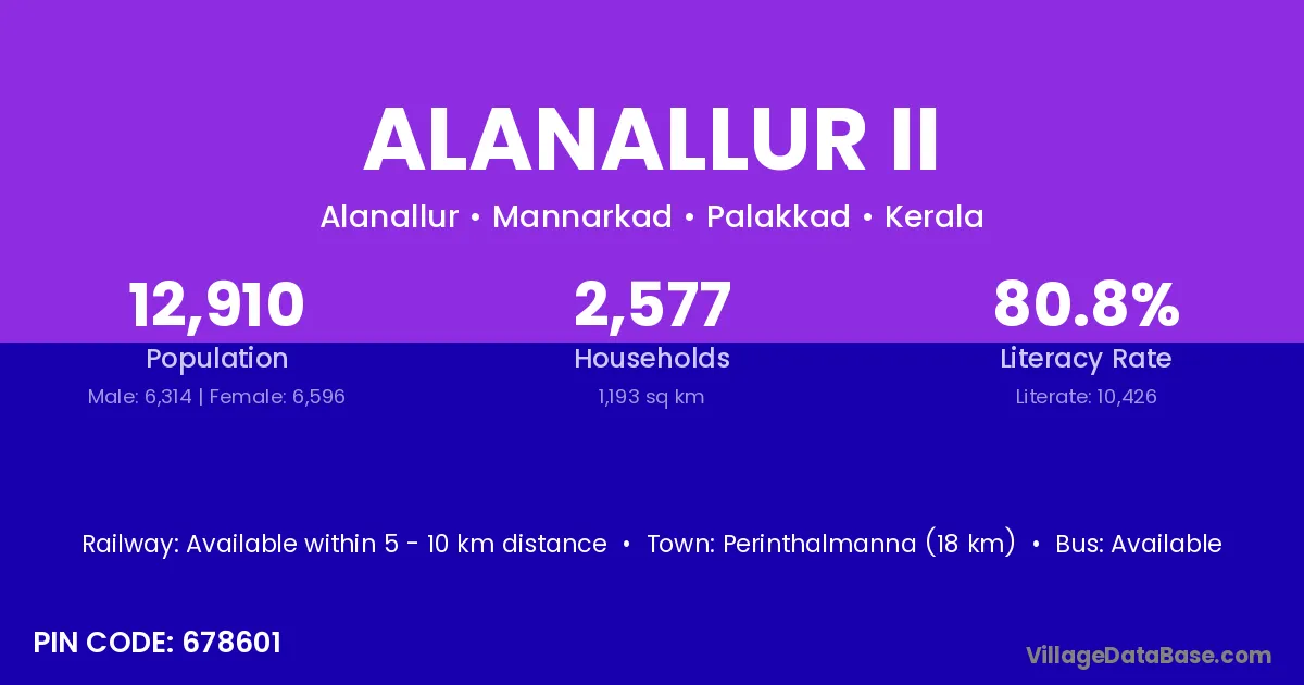 Perinthalmanna (18 km) is the nearest town to Alanallur Ii village for major economic activities and is located approximately 18 km away.