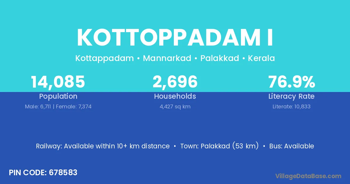 Palakkad (53 km) is the nearest town to Kottoppadam I village for major economic activities and is located approximately 53 km away.