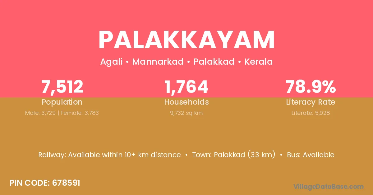 Palakkad (33 km) is the nearest town to Palakkayam village for major economic activities and is located approximately 33 km away.