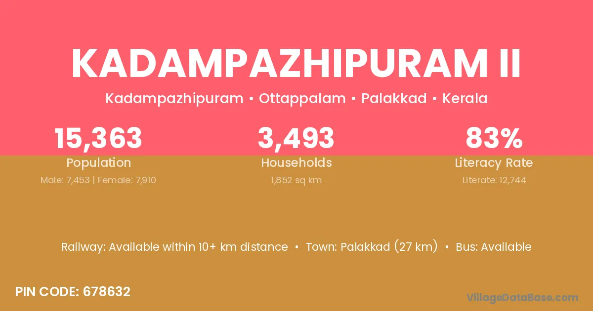 Palakkad (27 km) is the nearest town to Kadampazhipuram Ii village for major economic activities and is located approximately 27 km away.
