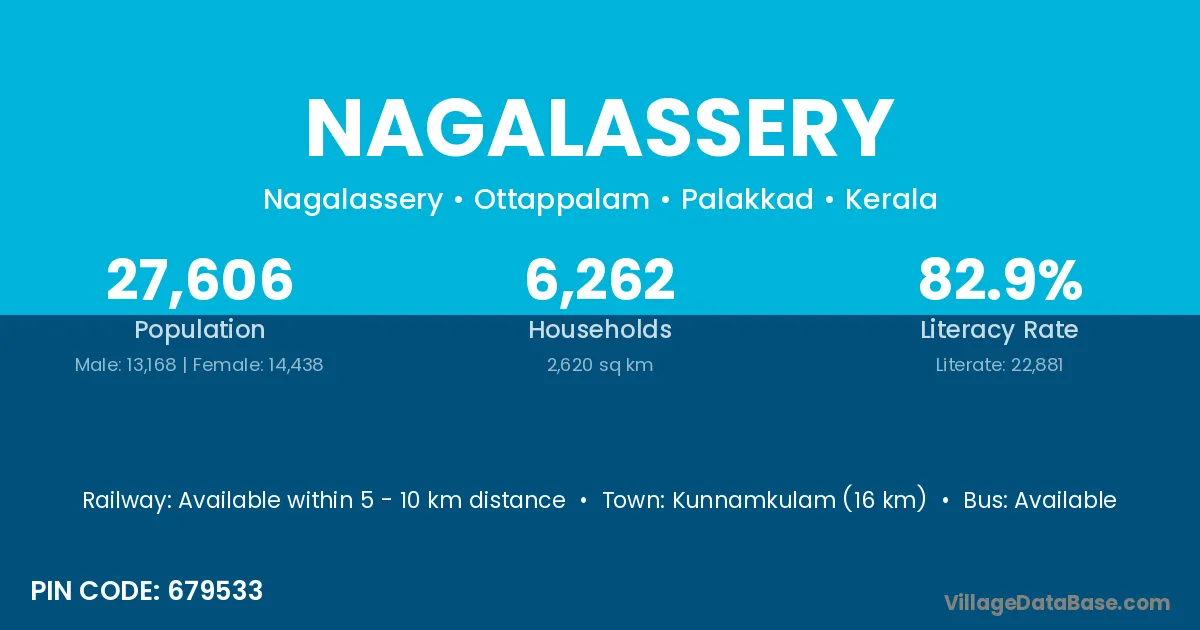 Kunnamkulam (16 km) is the nearest town to Nagalassery village for major economic activities and is located approximately 16 km away.