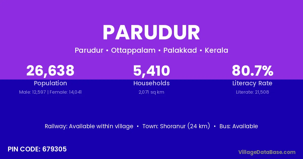 Shoranur (24 km) is the nearest town to Parudur village for major economic activities and is located approximately 24 km away.