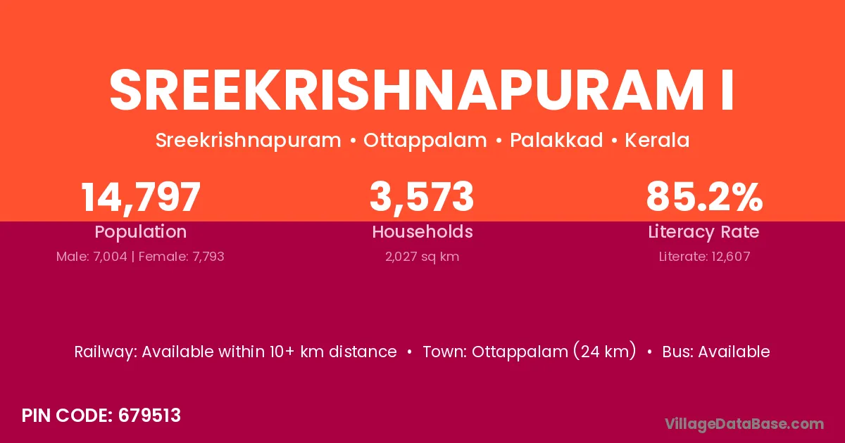 Sreekrishnapuram I village has a total population of 14,797 people, of which 7,004 are males and 7,793 are females.